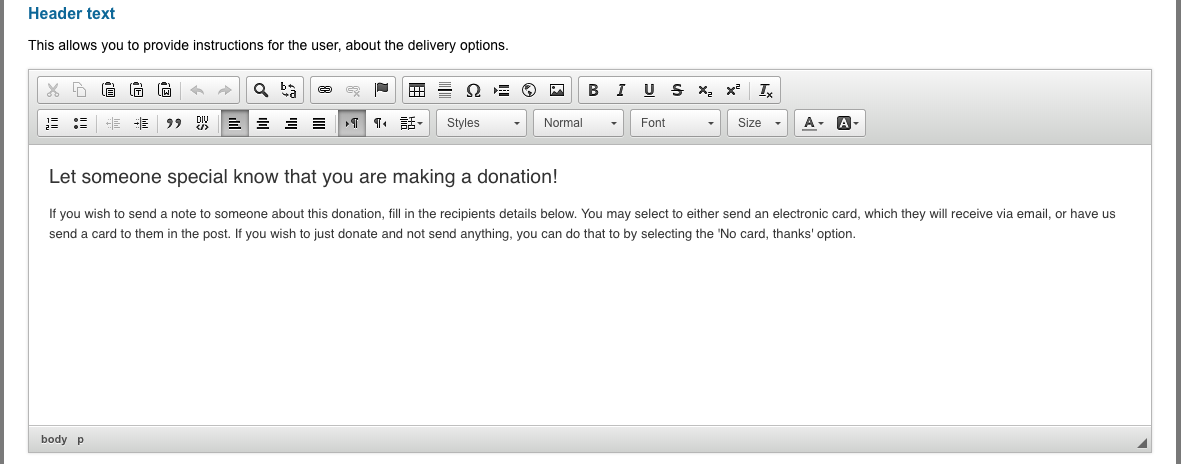 The header text displays above the list of gifts to personalize. It uses a standard editor and comes with some default text: