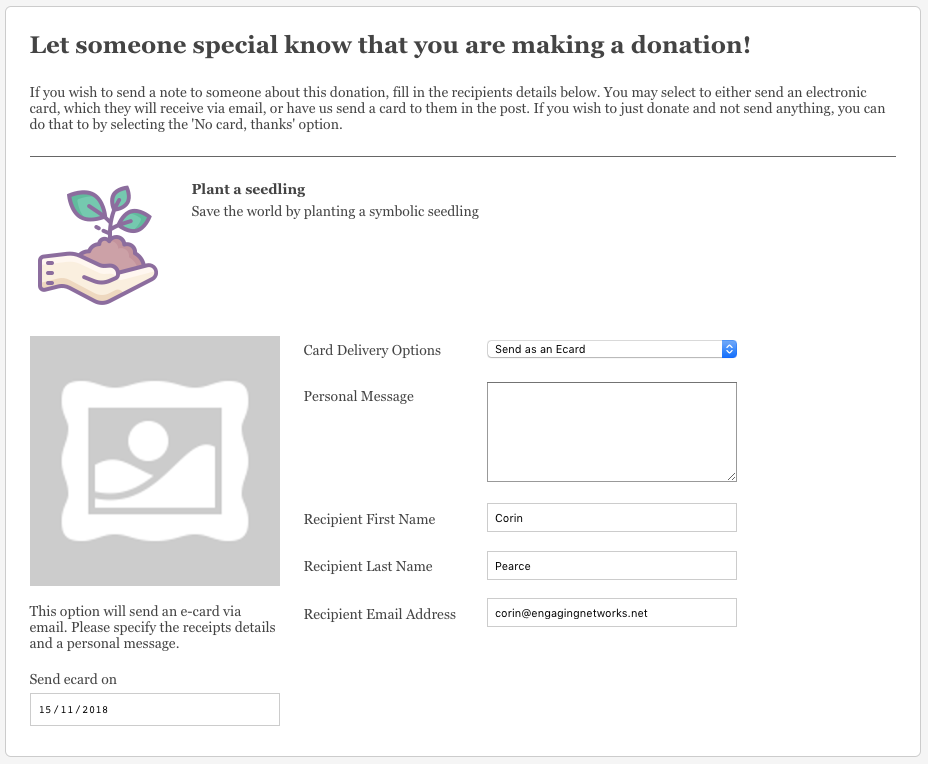 There are three options available for delivery of the gift, which you can choose to display or not. The options available to the supporter are to either choose to send an e-card (an email sent to the recipient – this uses the template set in the product), a physical card (which would need to be fulfilled by you) or they can choose to send no card at all.