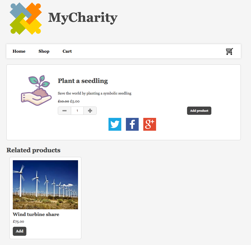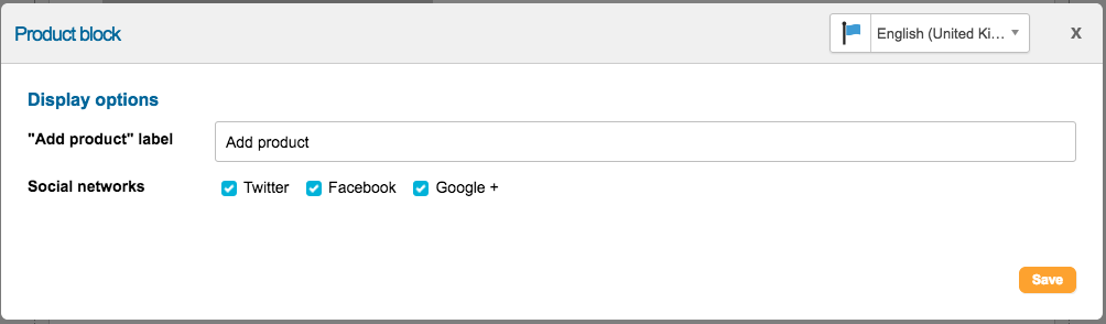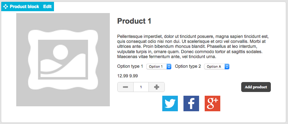- You can add Twitter, Facebook and Google+ buttons to the product if required. The buttons will either auto-generate a tweet of the format “Product title URL”, or otherwise post the URL of the product page to Facebook or Google+