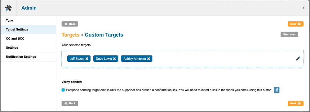 An email-to-target Page Builder page includes a “Target settings” area in which you specify the targets of your supporters’ emails when they take action. The targets can either be selected automatically from a postcode contact database, for example a Westminster MP in the UK, a Senator/House Rep in the US, or MPs in Canada — or from single contacts that you have added yourself.