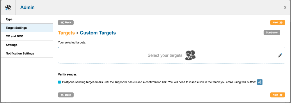 As an added security feature you can choose to use the Verify Sender option to validate the supporters email address. Checking this box means that the email to the target will not be sent until the supporter has clicked a link in a Thank You Email. This link will only be valid for 24 hours.
