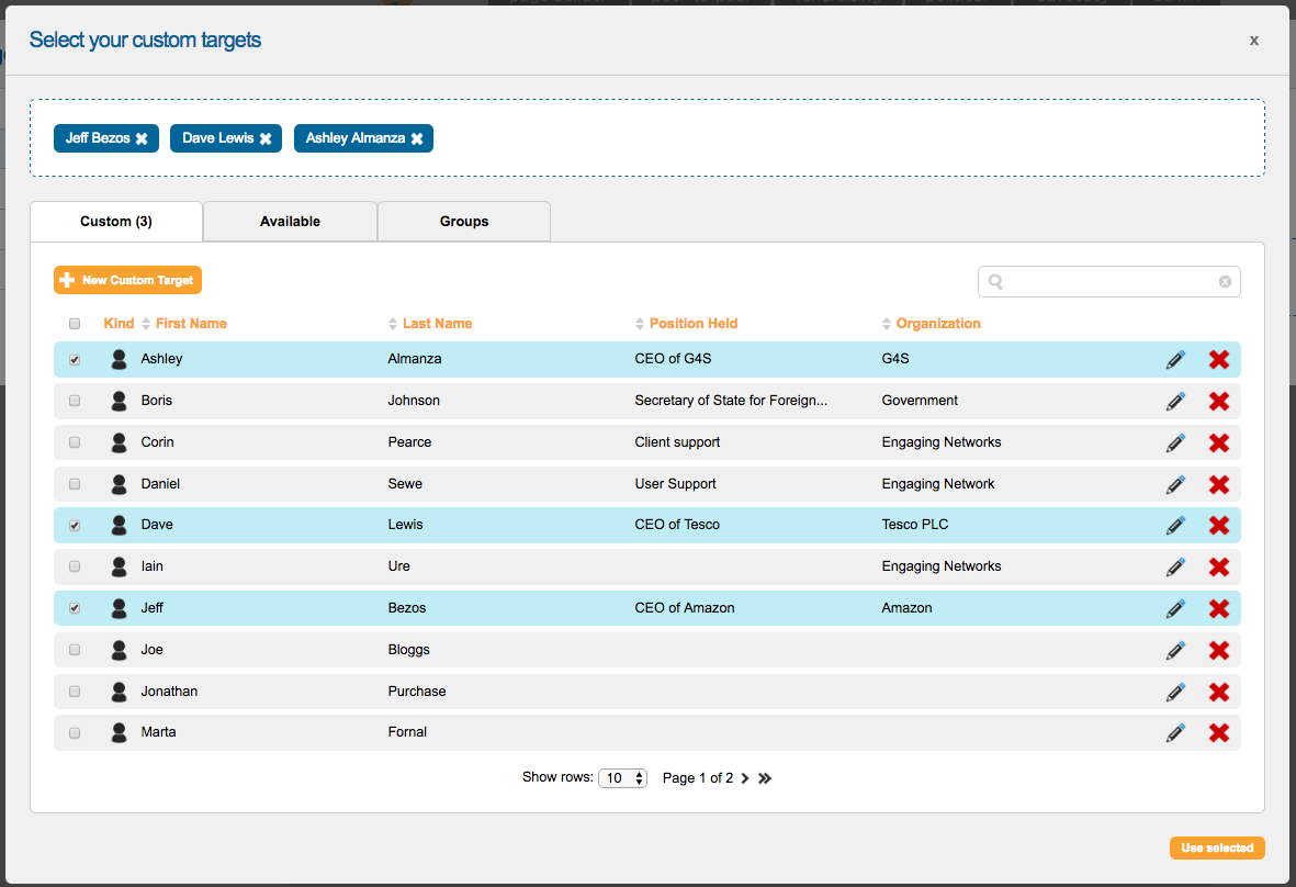 This lists your available custom targets. If necessary you can create a new custom target via the “New Custom Target” button at the top left. Once ready, tick the people you would like to be added as targets for your action.