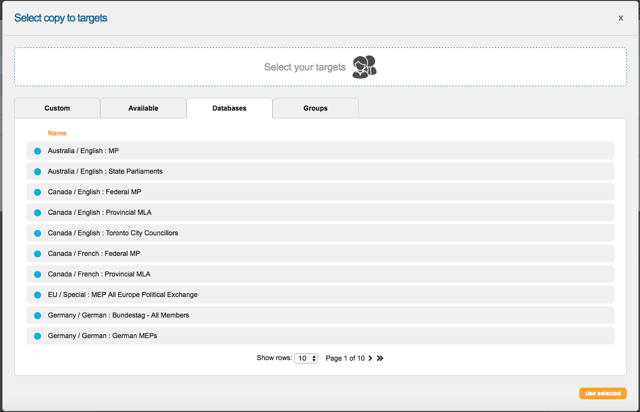 So not only are you able to copy-in custom contacts in the system (under the Custom and Groups tabs), but you can also copy-in a database which will select the contact based on the supporter’s postcode that they enter when taking action, and also a “web form” (under the Available tab) for contacts that can’t be emailed directly.