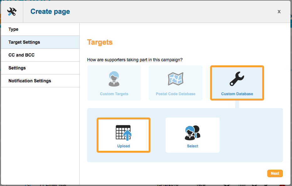 Alternatively, you may want to upload your own database to allow your supporters to dynamically choose targets depending on a matched field that the supporter selects. For example you could ask who their electricity supplier is, and it would select the correct target from your custom database based on that value. Read more.