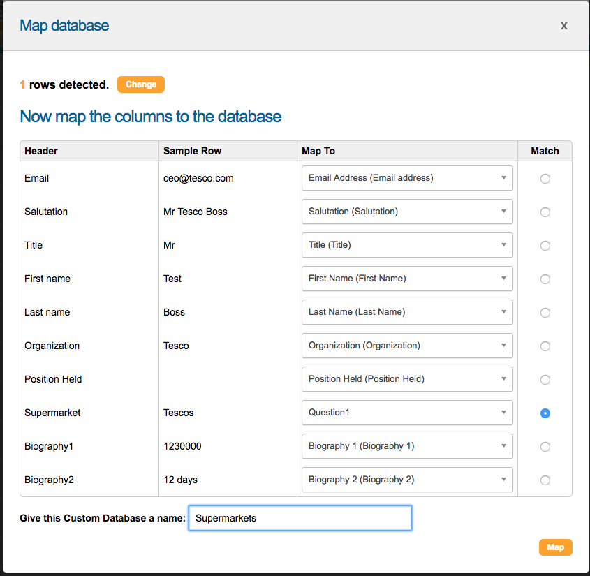 It will attempt to automatically guess at columns to “map to”. Ensure each column is mapped correctly. You also need to select a “Match” column – this is the field that it will use to look up the contact. Once you have done this, and given the database a name, click Map.
