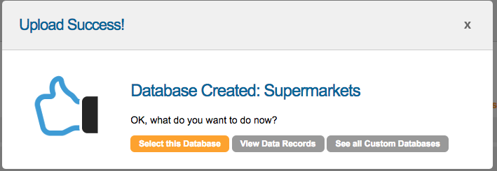 When you select that you want to use a Custom Database, you have a choice of uploading a new one, or selecting an existing database you have uploaded previously. If you select Upload, you will be shown a notice explaining the format of data we can accept.