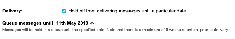 If you are using a postcode database and want to delay the sending of your target messages so they don’t send immediately, you can tick the Hold off from delivering messages until a particular date checkbox. Ticking this will require you to put a future date in. The messages will be queued when supporters take part until that day, in which they will all be sent. You can hold a maximum of six weeks of messages. This option is not available with custom targets or custom databases.