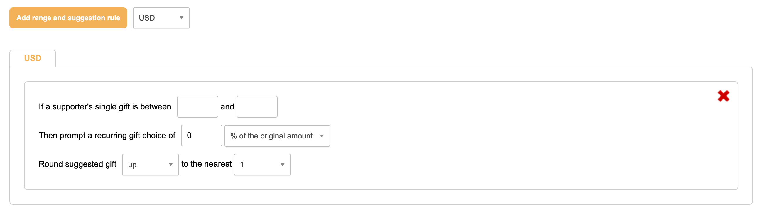 For Single to Recurring upsell rules, you may tailor the recurring gift amount based on a percentage of the original amount, or based on a flat amount.