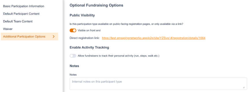 Public Visibility | With this setting enabled, the participation type will be public facing. With the setting disabled, it will not be available publicly (only via link) |