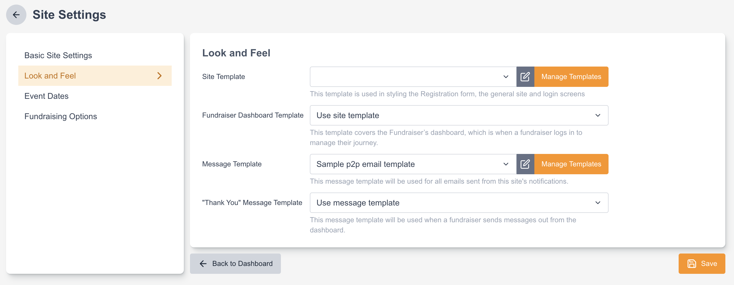 “Thank You” Message Template | This message template will be used when a fundraiser sends messages out from the dashboard. |
