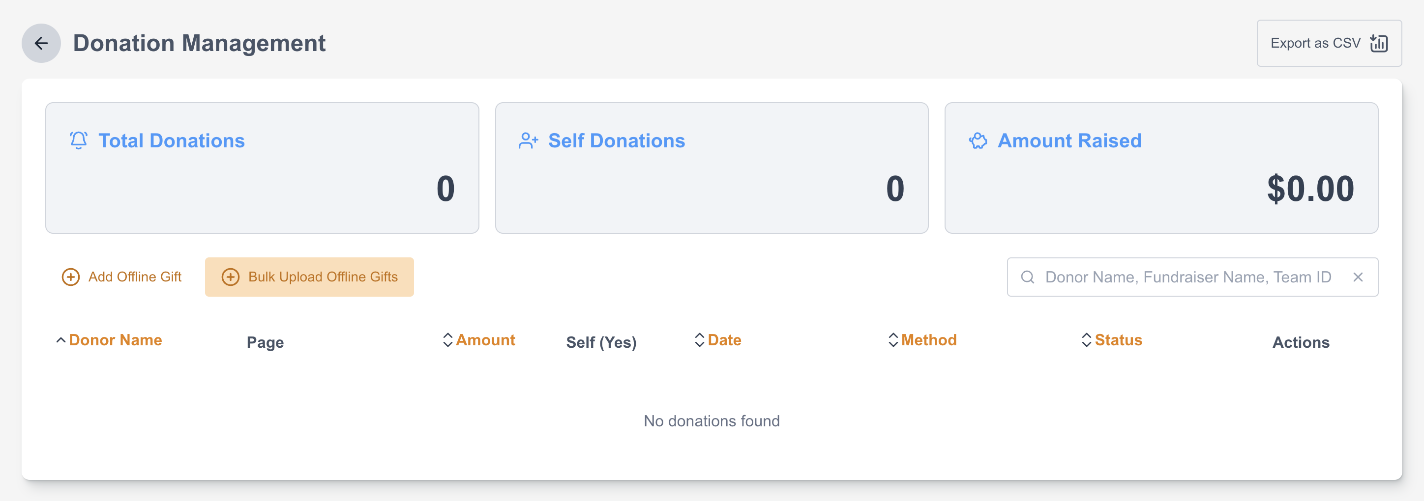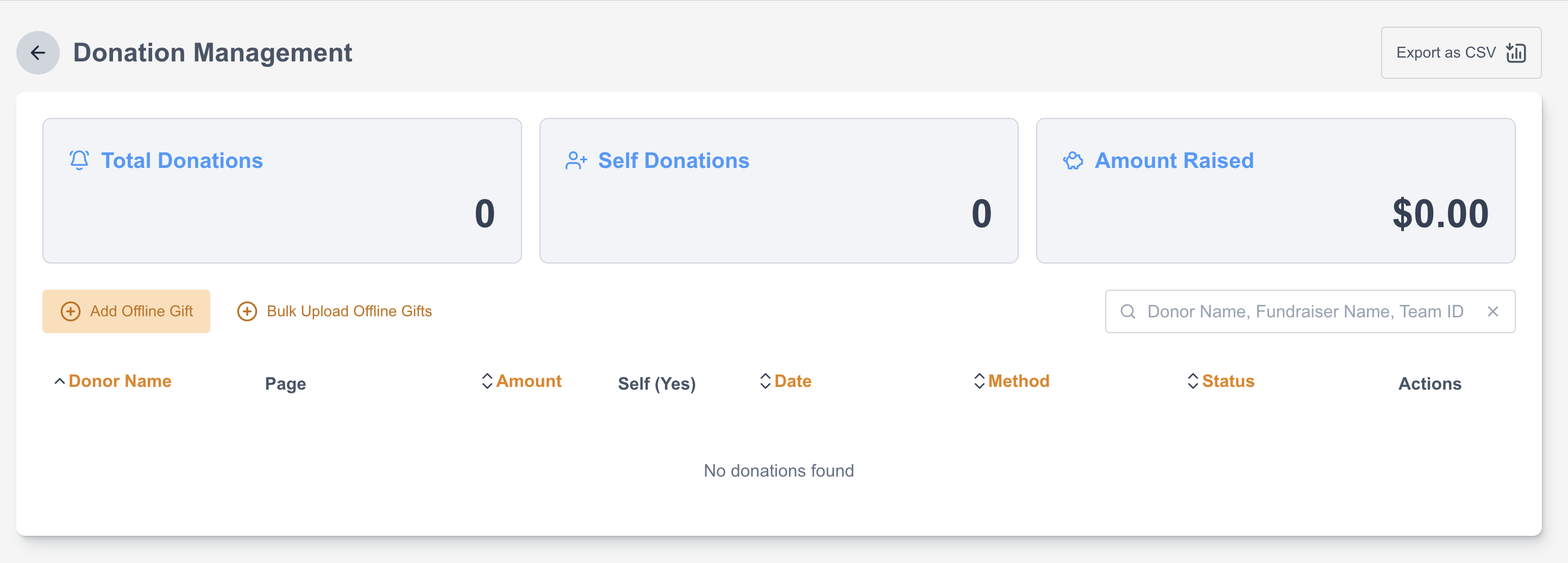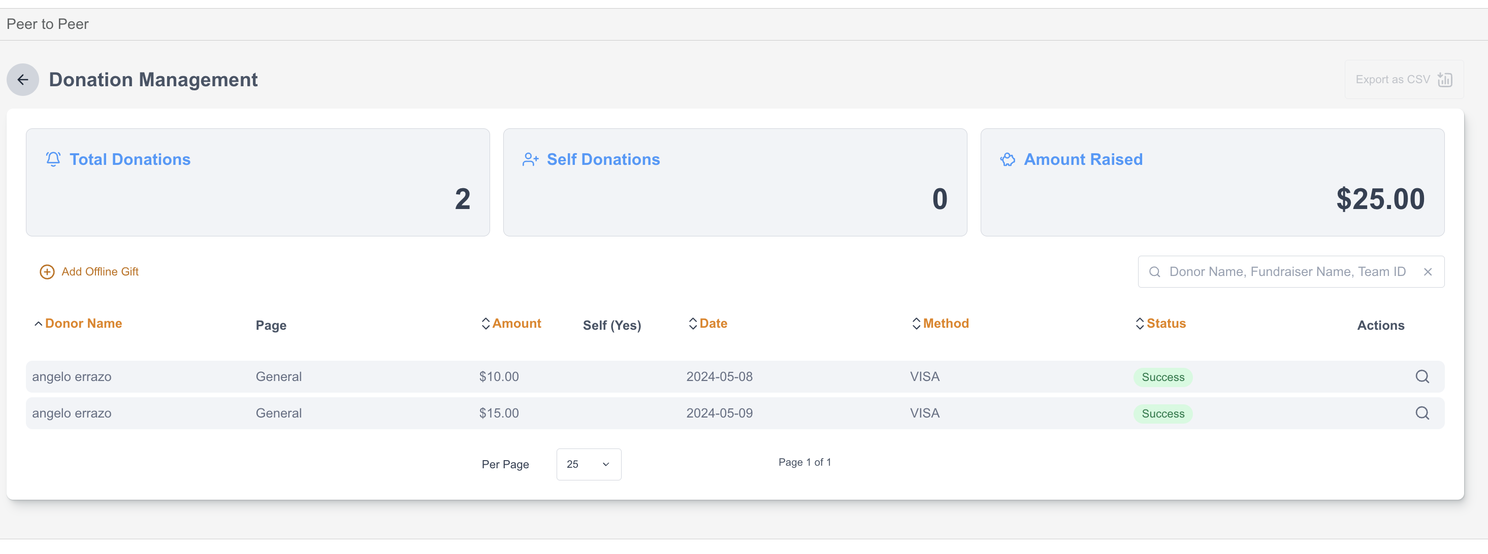 Under P2P > Sites > edit relevant site > Select Donations (under Management). The Donation Management menu allows for the site donations or transactions to be viewed, managed and exported. Fundraisers and their transactions will be listed with additional columns of details. There is also a way for you to add your ‘Offline Gift’ from here.