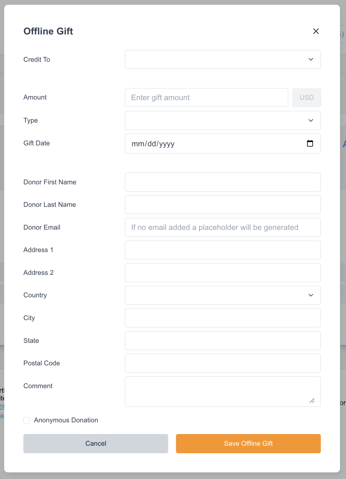 Gift Date | Able to select the date of when the transaction occurred. |
