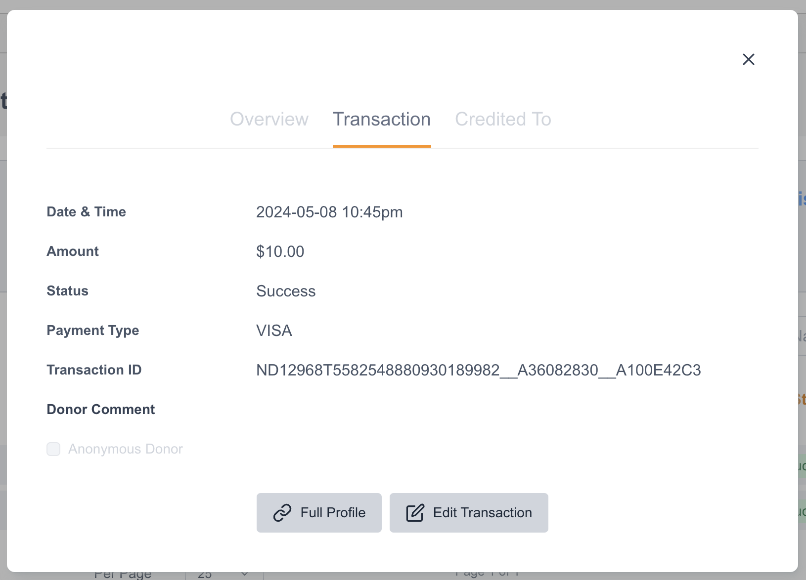 Credit To | Ability to select where the Transaction/Donation will be added to. It could be to a specific Fundraiser Page or just a regular donation to the site. |