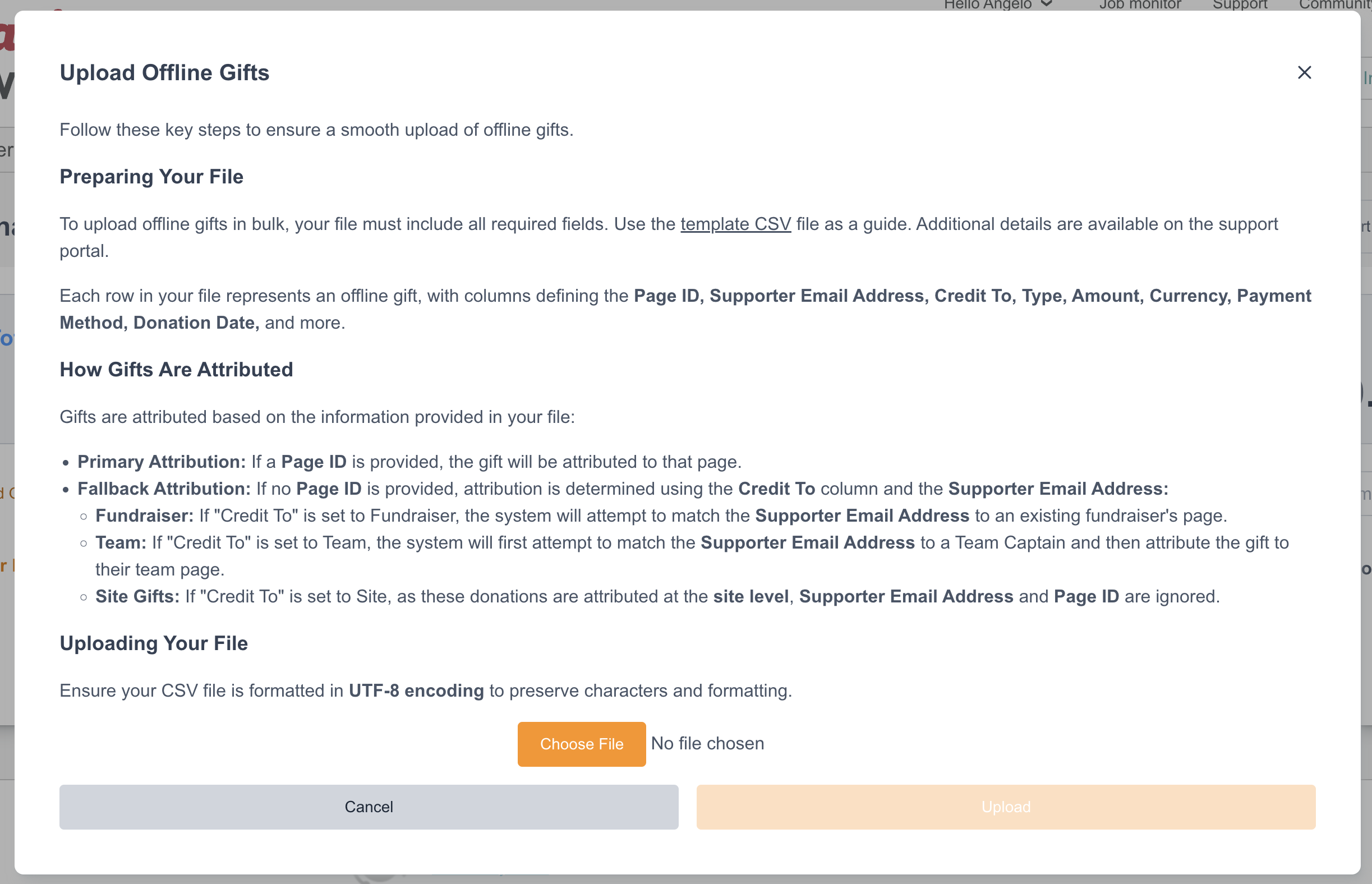 You can import a Bulk Offline Gift directly to the site from the Donation Block. Simply click on the Bulk Upload Offline Gifts button and a pop-up window will reflect with information on how to import your offline transactions/gifts. Donations can be attributed to a site, team or individual based on Page ID, with fallback option of email address for fundraisers and teams. You just need to follow the guide given to ensure you import the correct information needed without running into any issue/error during the import: