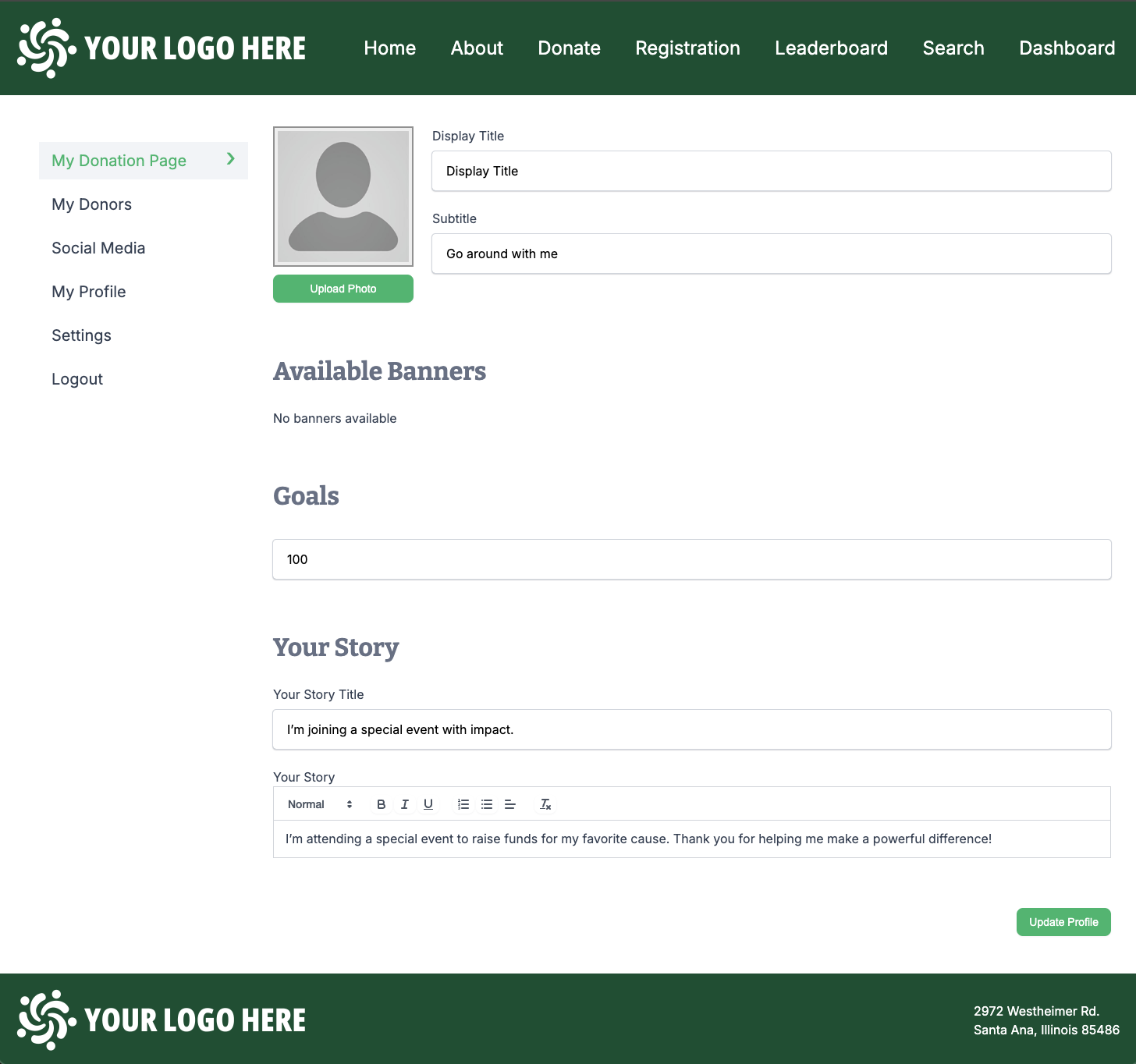 In the fundraiser dashboard, fundraisers can see the overview of the performance of the different page types (Team Page, Donation Page, Donor list, Team Members) associated with them. This area also allows fundraisers to manage their Settings and Profile.