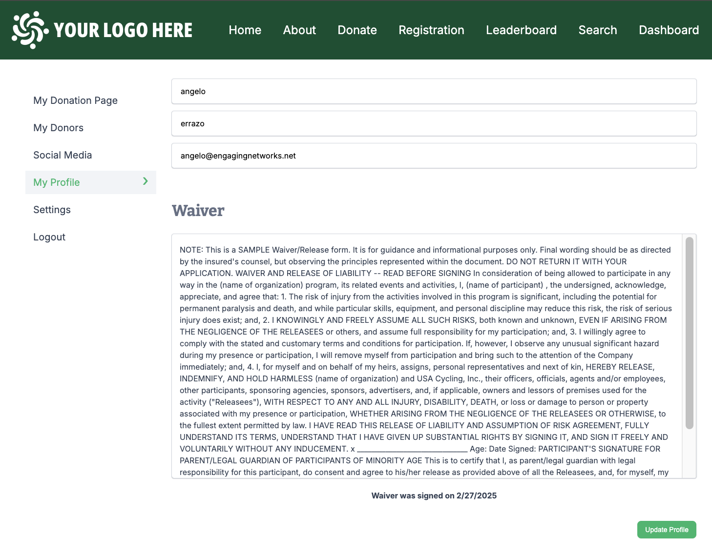 As the participant waiver copy is defined within the participant object, the respective text will be displayed when the user accesses their profile dashboard. If the waiver is disabled at the participant type level, the waiver block will not be displayed.