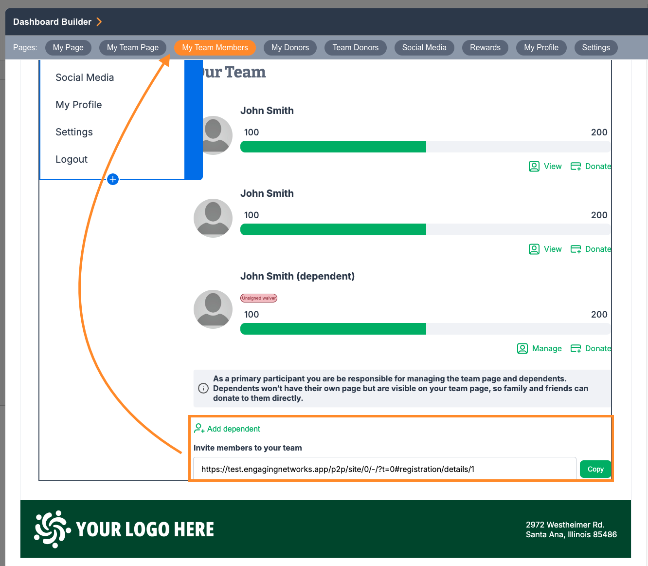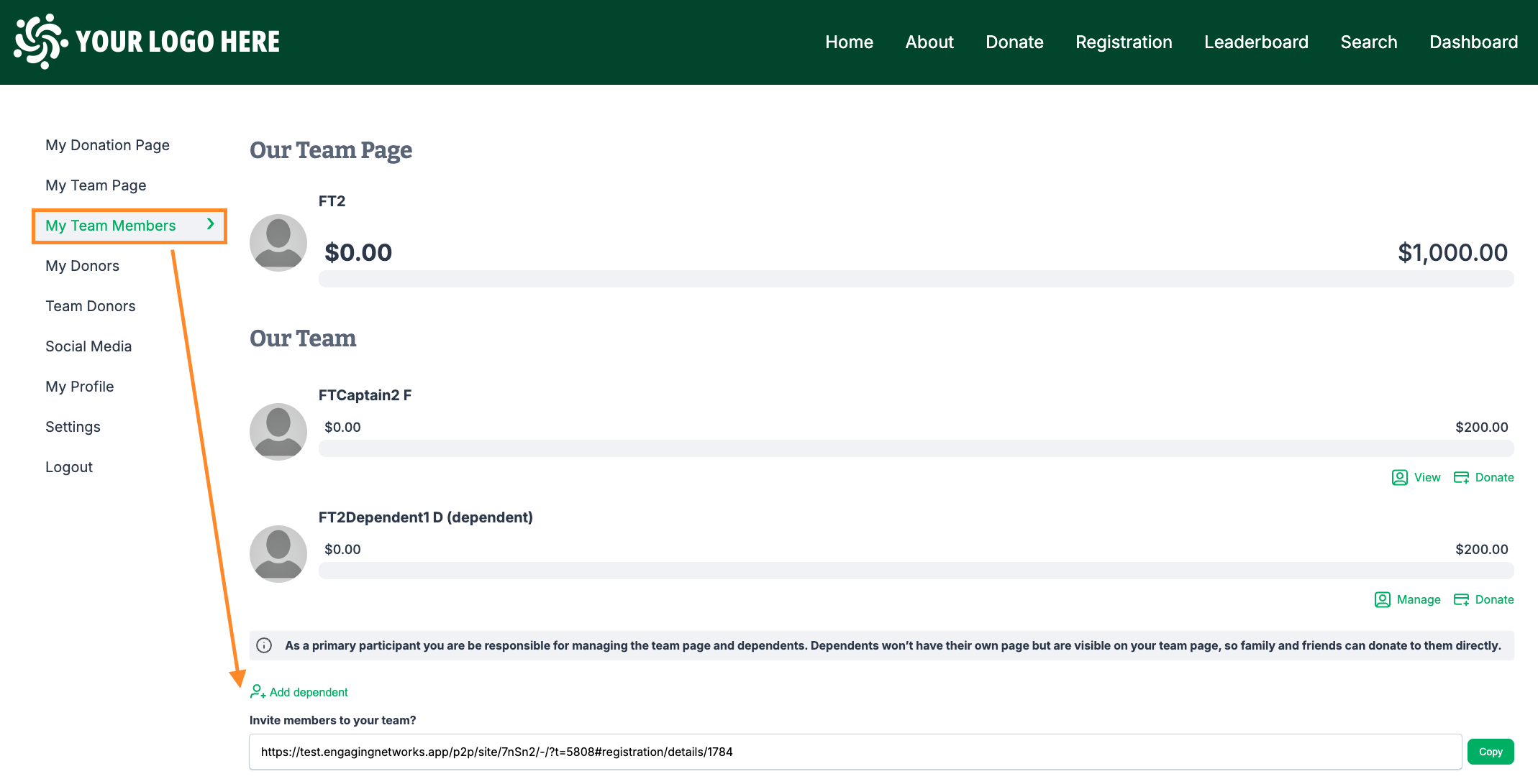 In the Fundraiser’s Team Dashboard you can simply click on the “Add dependent” button at the bottom of the “My Team Members” page. As well as an “Invite Link” they can share to others who want to be part of their team.