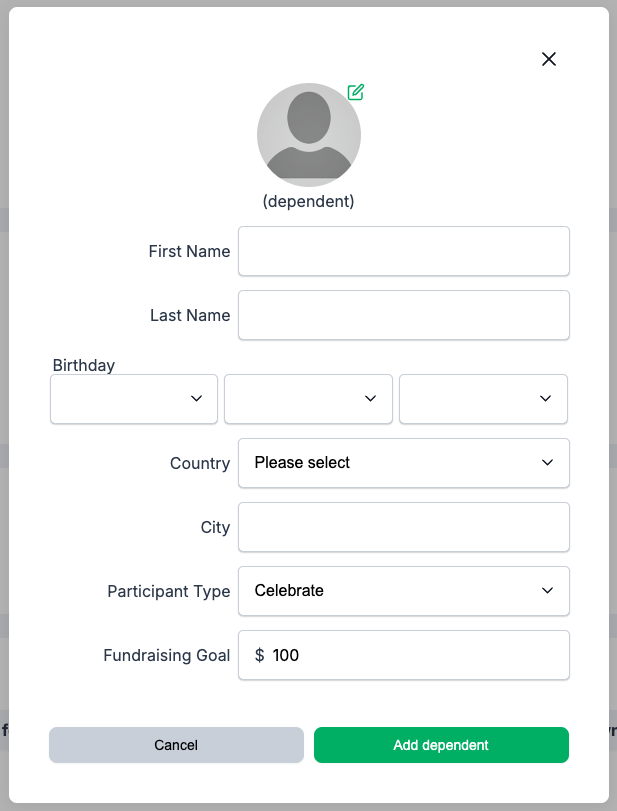 When Adding a dependent you have the ability to complete different required fields to capture them as a fundraiser (dependent). Fields like Name, Participation Type and Fundraising Goal can be updated from here: