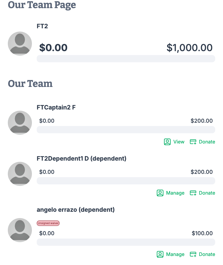 From here you can manage the dependent details again or you can do the donation on their behalf which will trigger a redirect to the donation page for the team captain to complete the transaction.