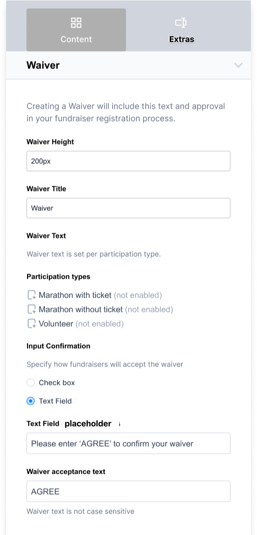 - When ‘Text Field’ is enabled, this allows you to set the placeholder text and the acceptance value for the fundraiser to submit.