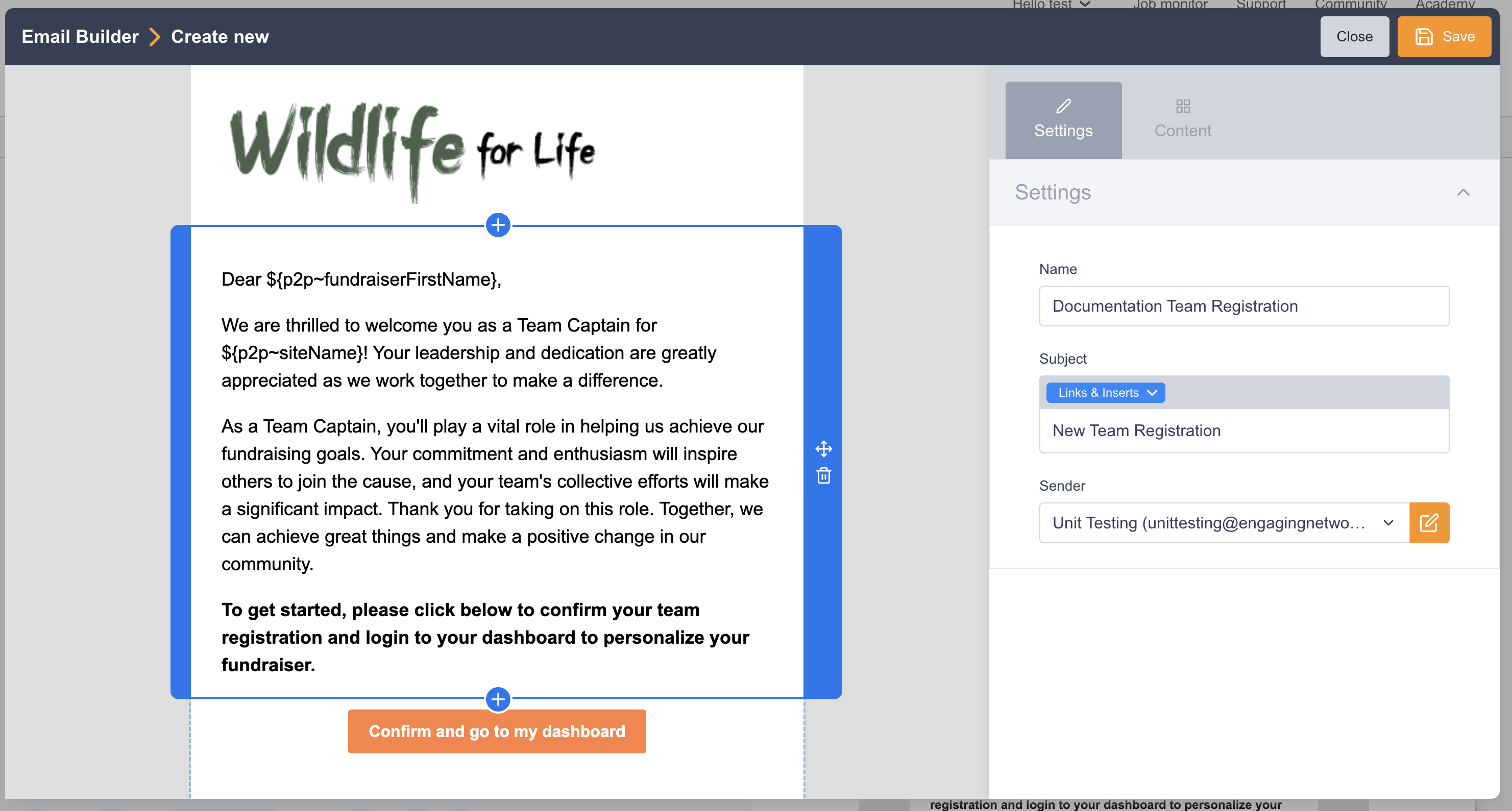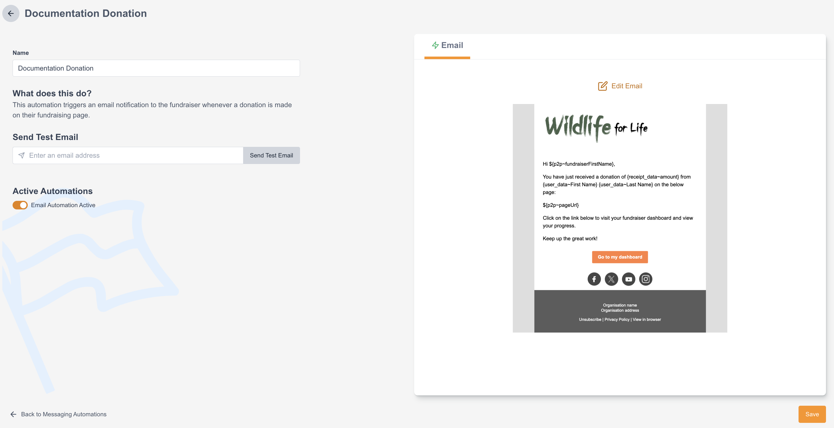 Donation | This automation triggers an email notification to the team captain whenever a donation is made on their team page. |
