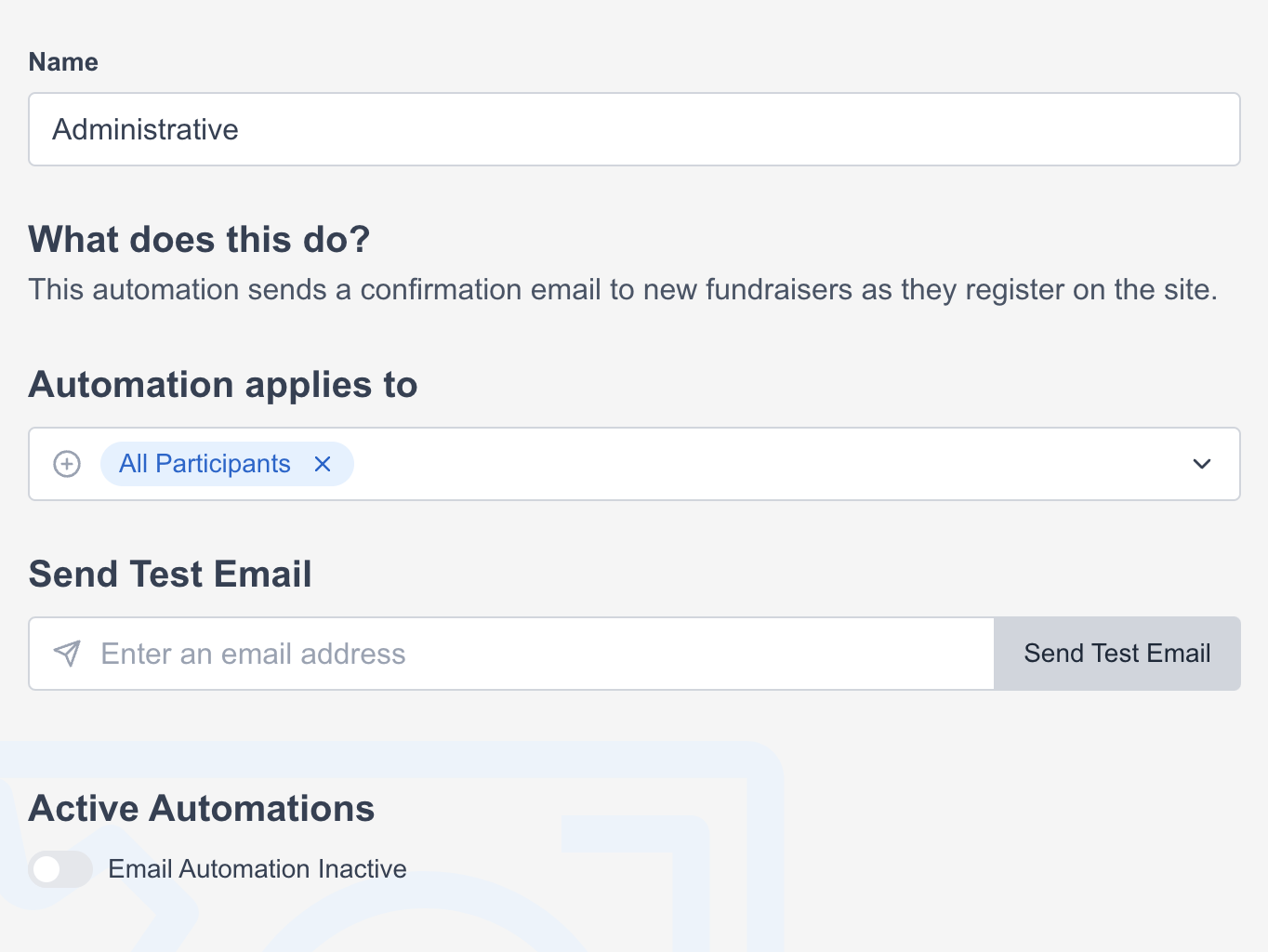 Administrative | This automation sends a confirmation email to new fundraisers as they register on the site. |