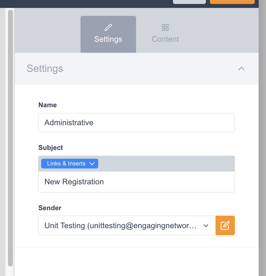 In this section, you can specify the email name, execute a test send, and modify the email's content. This functionality parallels the features in our Marketing Tools for Broadcast Emails. You can add content blocks, insert text and hyperlinks, and configure key email parameters, including sender information and subject lines.