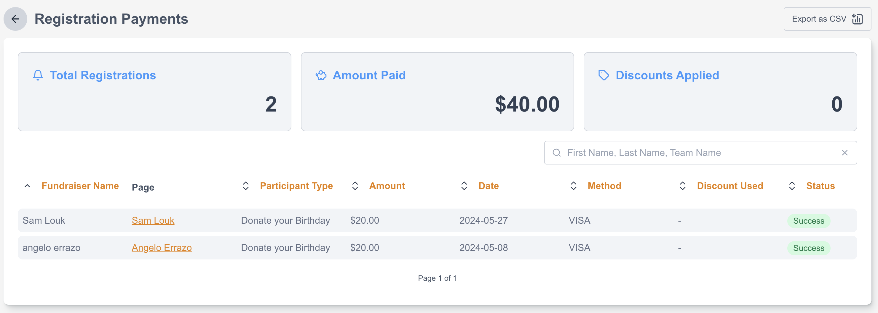 The search bar can be used to search for participants by First Name, Last Name, Team Name. The Participant list can also be filtered by Fundraiser Name, Participation Type, Registration Amount, Date of Transaction, Method of Payment, Discount Code used & Transaction Status.