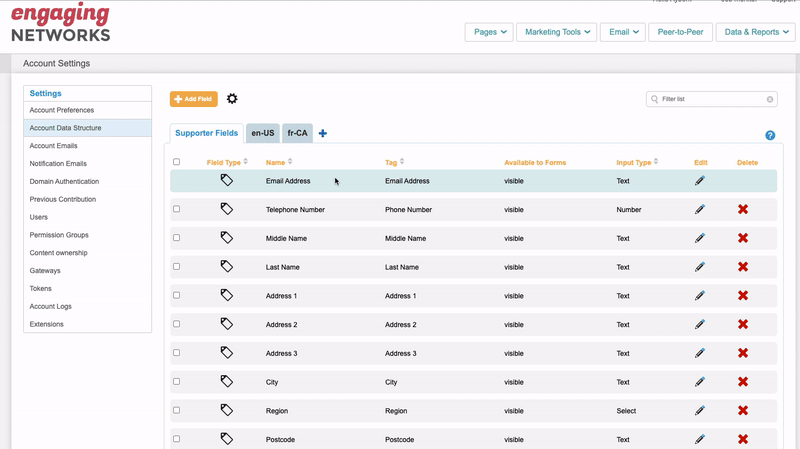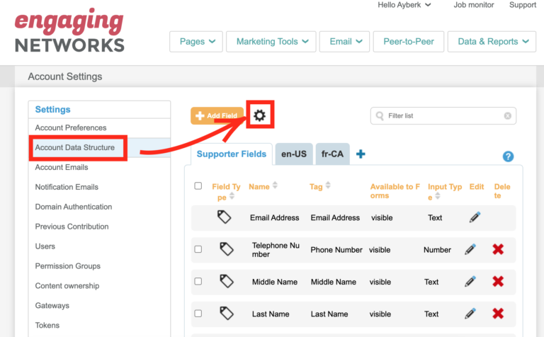 All supporter information (email, name, surname, city, age etc.) is stored in your account based on the fields and tags that are created in your account. You can adjust or modify the data structure by using the gear button on your Account Data Structure page.