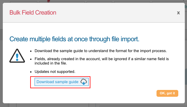 After you click the Bulk Field Creation button, on the pop-up screen you will be able to download this sample guide for your own use.