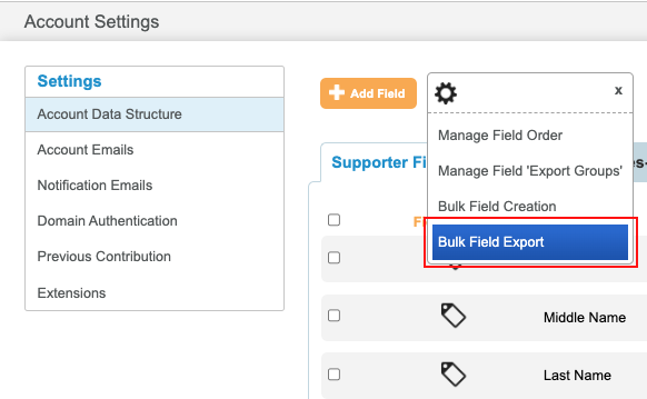 On the Account Data Structure page, if you click the Bulk Field Export button from the dropdown list, a .csv file will be downloaded onto your device instantly.