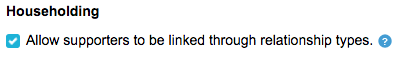 Householding allows you to create relationships between supporter records, as well as set a supporter as a primary contact for a household. Setting relationships can either be done via import or in the Lookup Supporters module. If you would like to use this feature you will need to enable it in your Account Preferences.