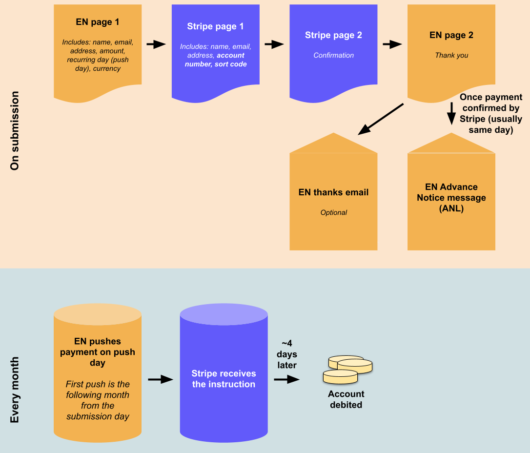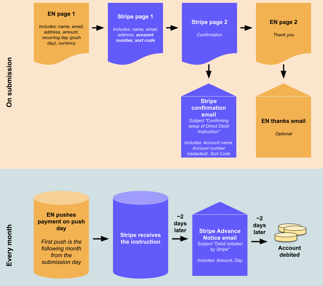Stripe will automatically send emails to the supporter about their direct debit, but you can also send an auto-acknowledgement email thank you email too if you wish, which can include details such as the supporter’s details, their Direct Debit Amount, Recurring Day and Frequency (but not the account number or sort-code since Stripe handles that)