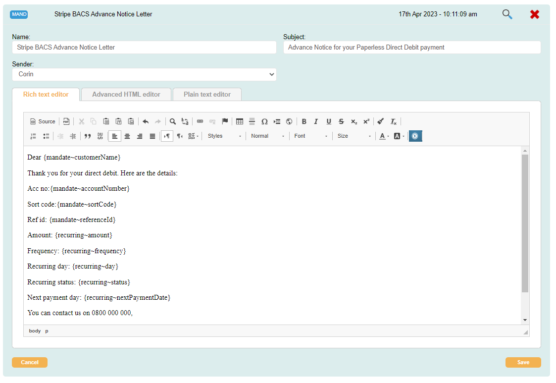 CODEAmount: £{recurring~amount}Recurring Frequency: the frequency of the direct debit, e.g. MONTHLY